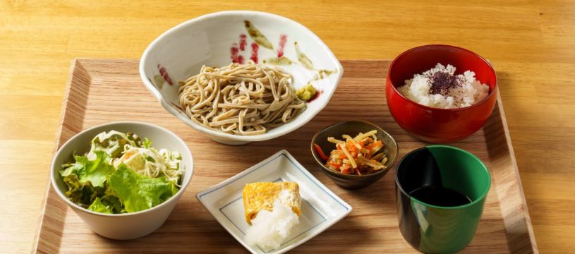 お食事は、八ヶ岳山麓の蕎麦粉を100%使用した十割蕎麦のセット、オリジナル配合のうどんセット、ご飯のセットよりお選びいただきます。