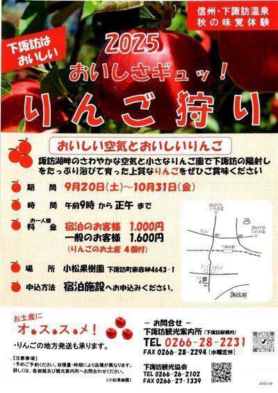 当館では、下諏訪温泉にご宿泊のお客様限定のりんご狩り体験をご案内しております。